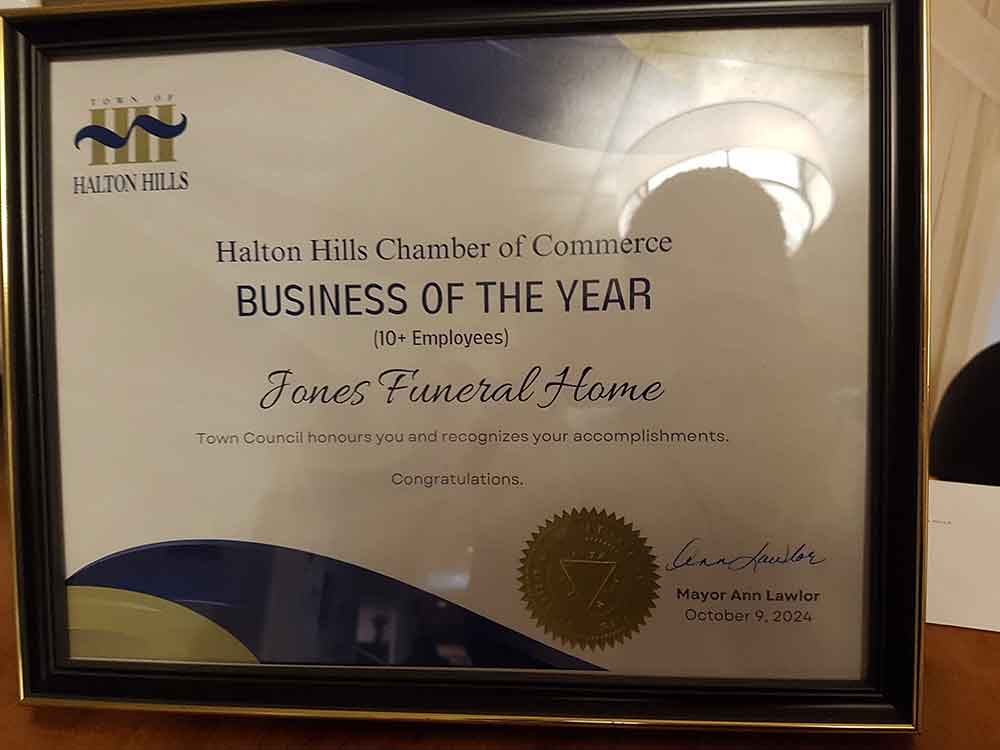 In 2003 we were honoured with the Halton Hills Business of the Year award. This prestigious award was the culmination of almost 50 years of the Jones family’s involvement in funeral service in Georgetown and the surrounding areas.